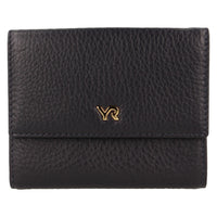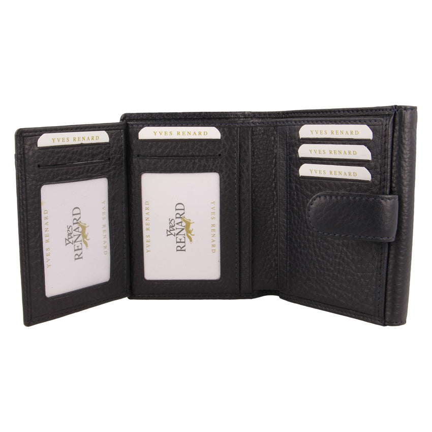Tijdloos lederen damesportemonnee met een apart deel voor muntjes ingedeeld in twee vakken en een open zijvak. Dit compartiment sluit af met een drukknop. In het andere compartiment is er ruimte voor tien bankkaarten, identiteitskaart en/of rijbewijs waarvan twee transparant, twee ruime vakken voor bankbiljetten, zes open vakken en uitneembare mica. Sluit af met een lipje met stevige drukknop.